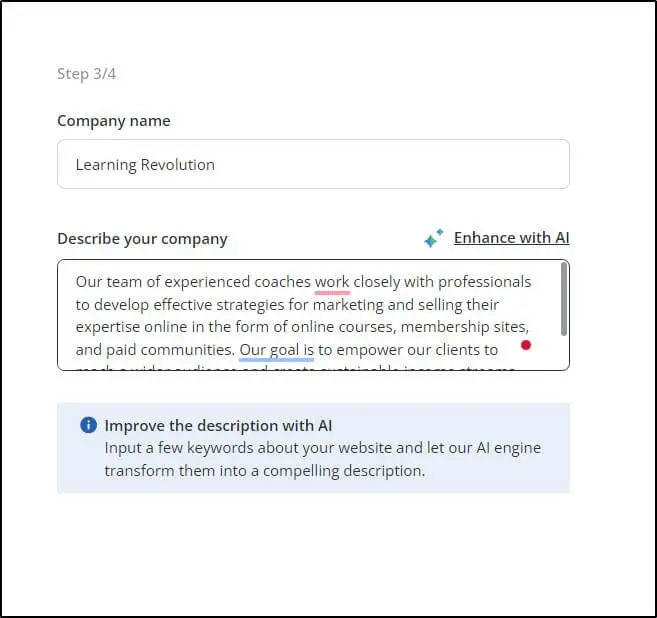 If you’re short on time or can’t articulate your goals, just give 10Web keywords about your business and use the “Enhance With AI” feature to generate a business description.